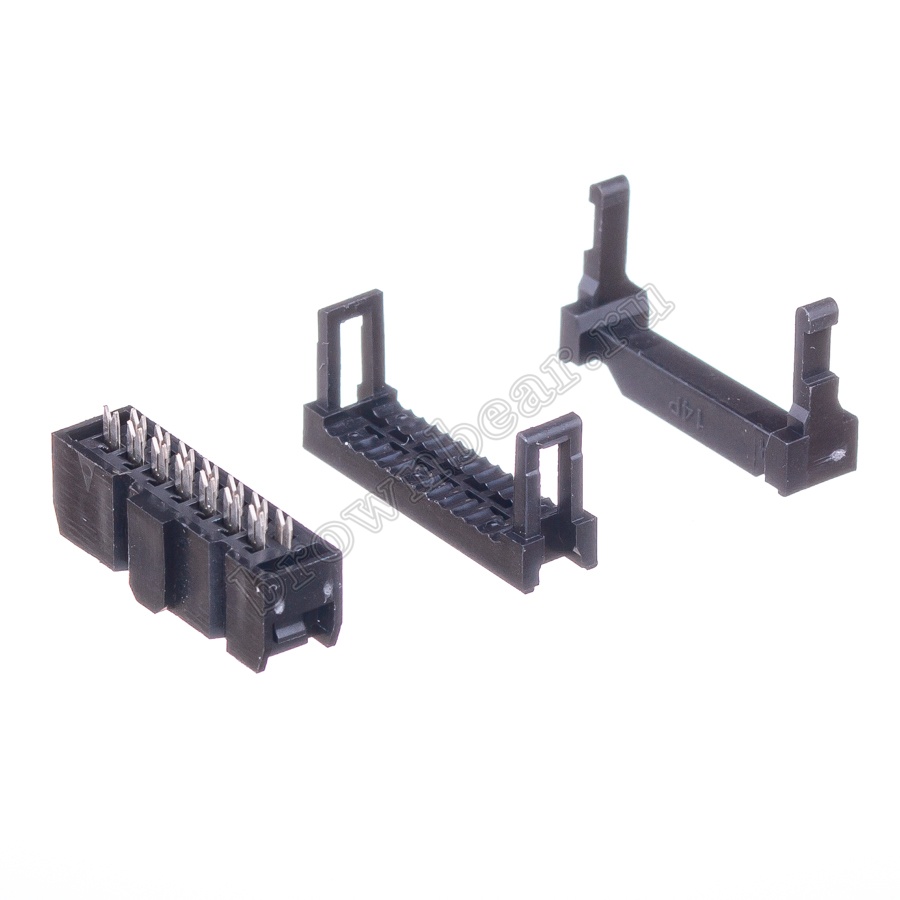 Разъём IDC на шлейф, розетка 14 контактов с шагом 2.54 мм. В комплекте поставляется защёлка для дополнительной фиксации плоского кабеля в разъёме.