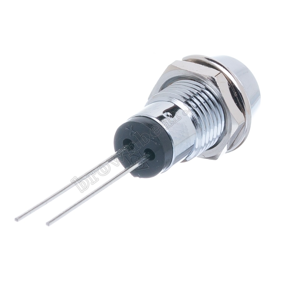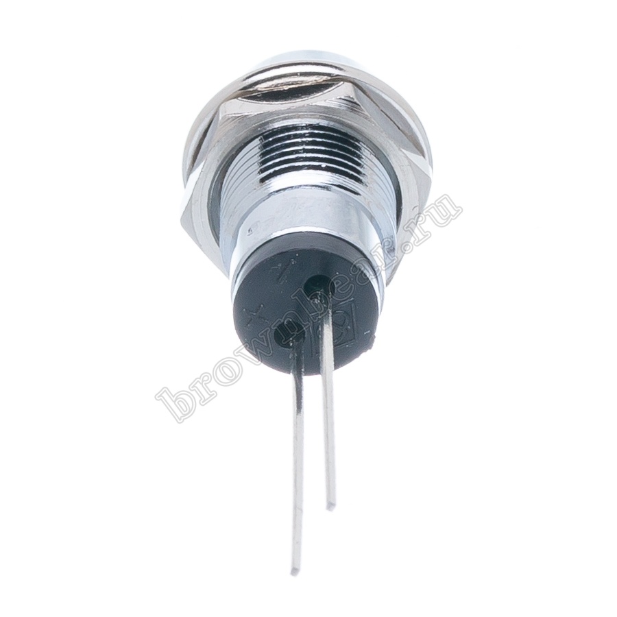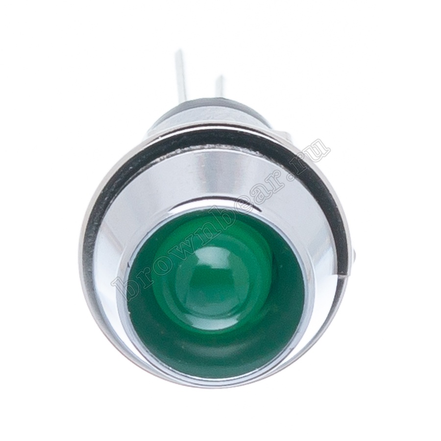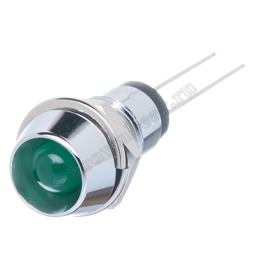 Зелёный светодиод в металлическом корпусе Ø 10 мм, с максимальной яркостью 12.0 mcd устанавливается на приборную панель с посадочным отверстием 8 мм, для световой индикации в различных устройствах, фиксируется гайкой.