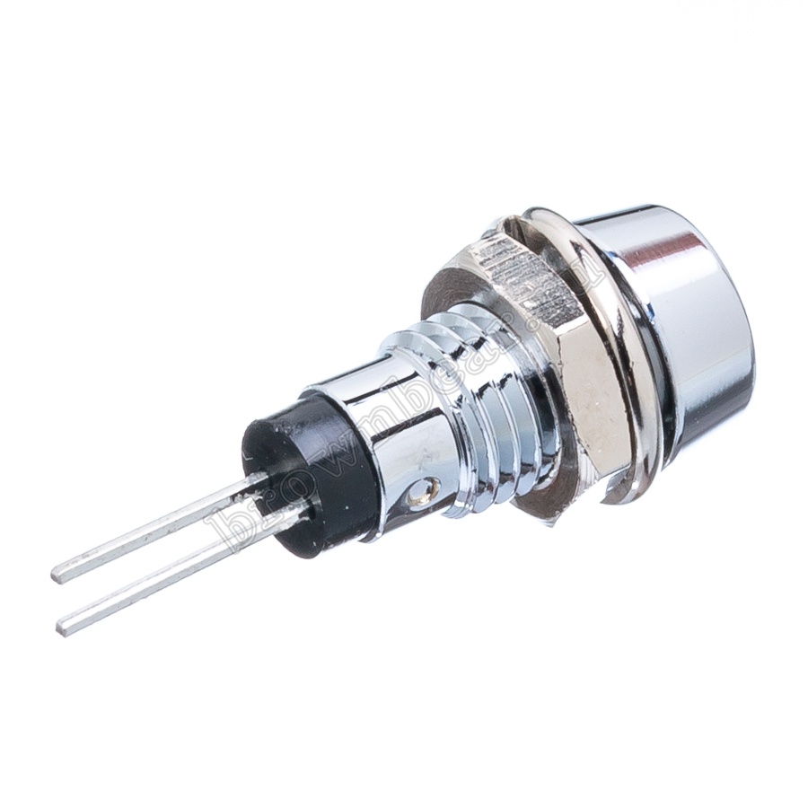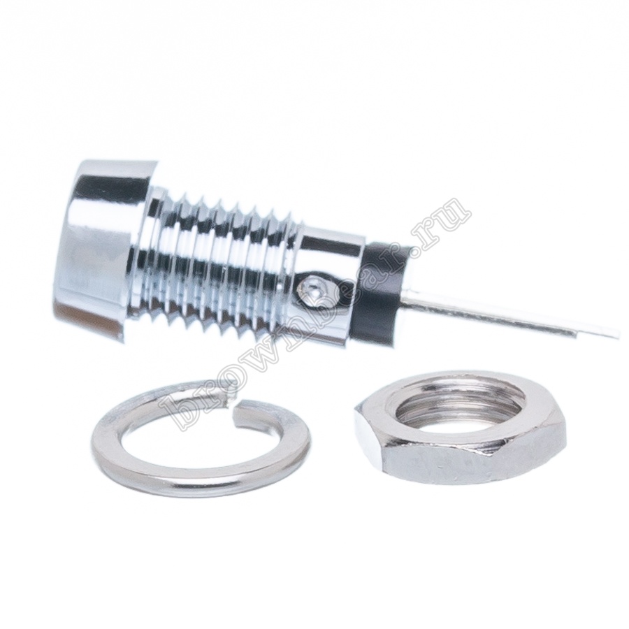 Зелёный светодиод в компактном металлическом корпусе Ø 8 мм, с максимальной яркостью 7.0 mcd устанавливается на приборную панель с посадочным отверстием 6 мм, для световой индикации в различных устройствах, фиксируется гайкой.