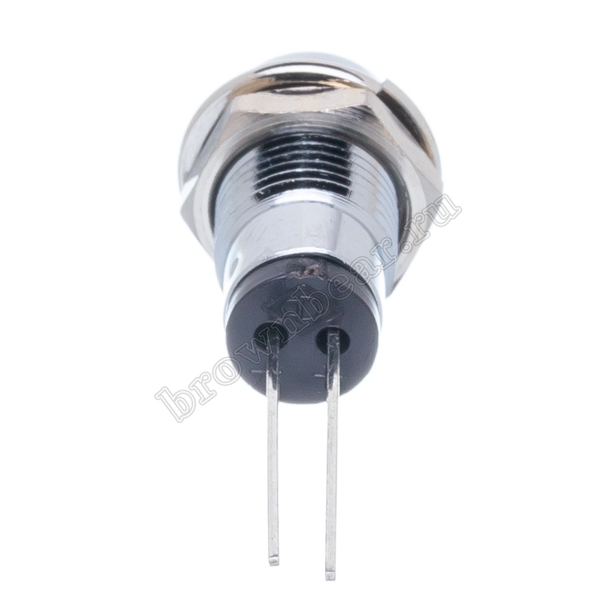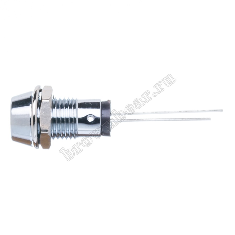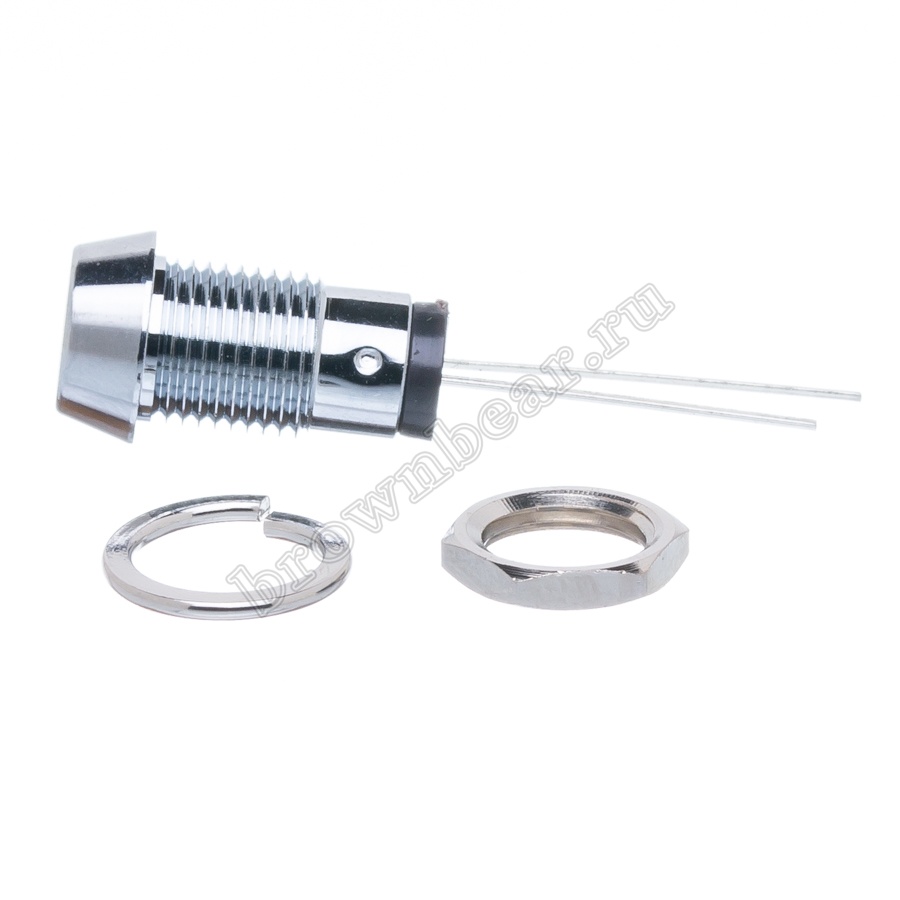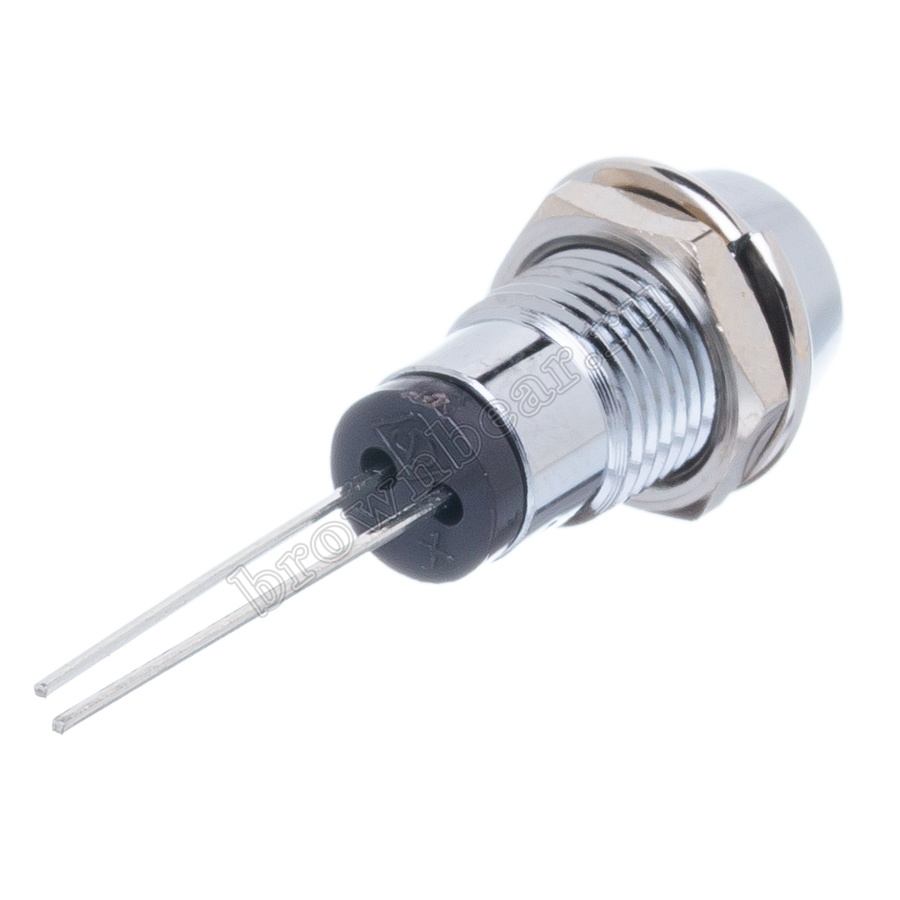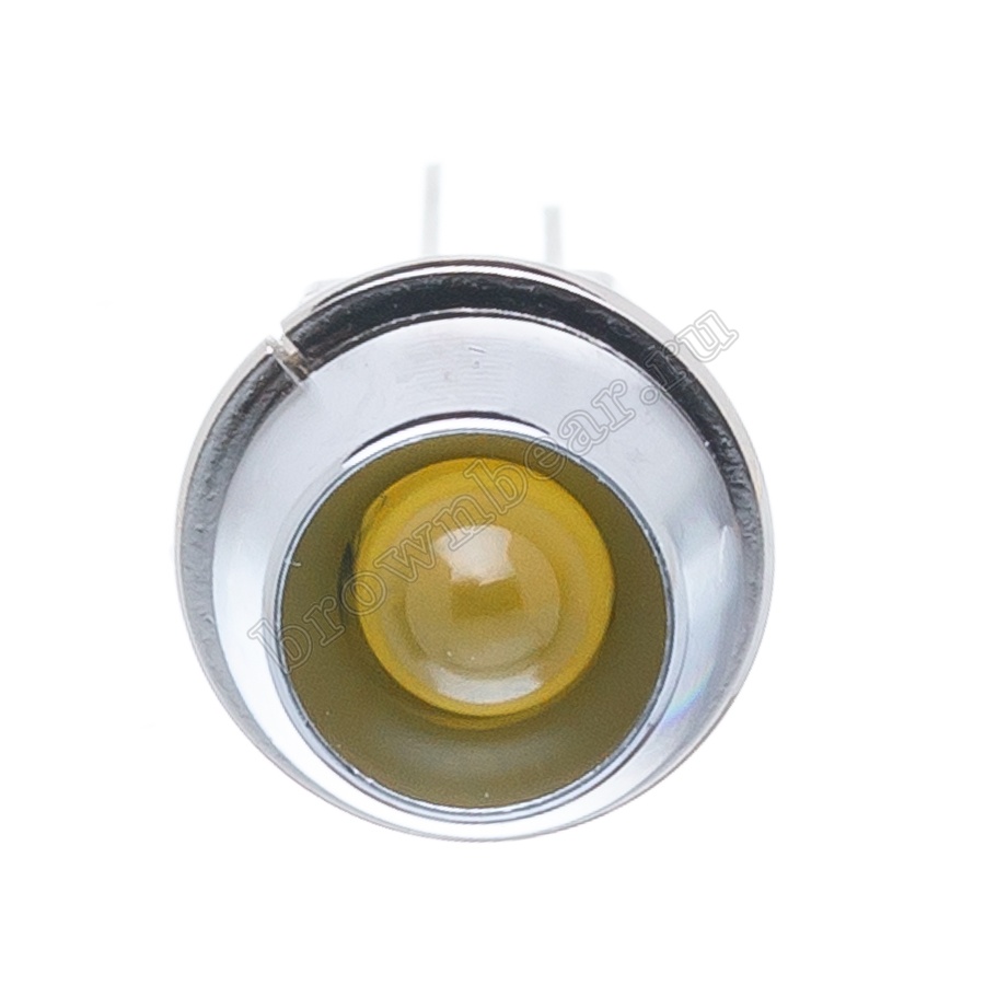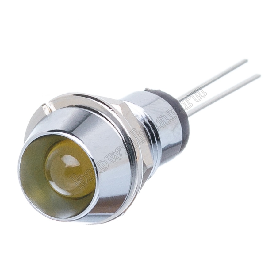 Жёлтый светодиод в металлическом корпусе Ø 10 мм, с максимальной яркостью 12.0 mcd устанавливается на приборную панель с посадочным отверстием 8 мм, для световой индикации в различных устройствах, фиксируется гайкой.
