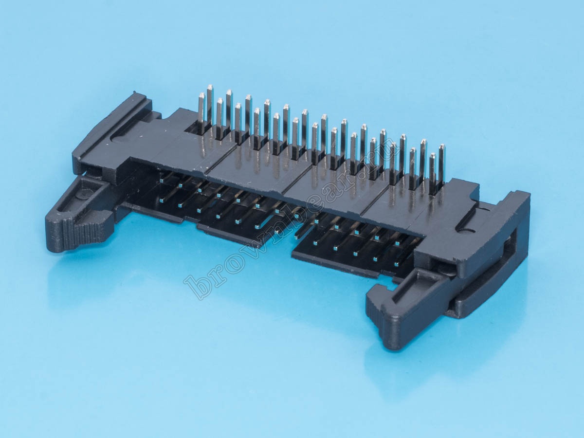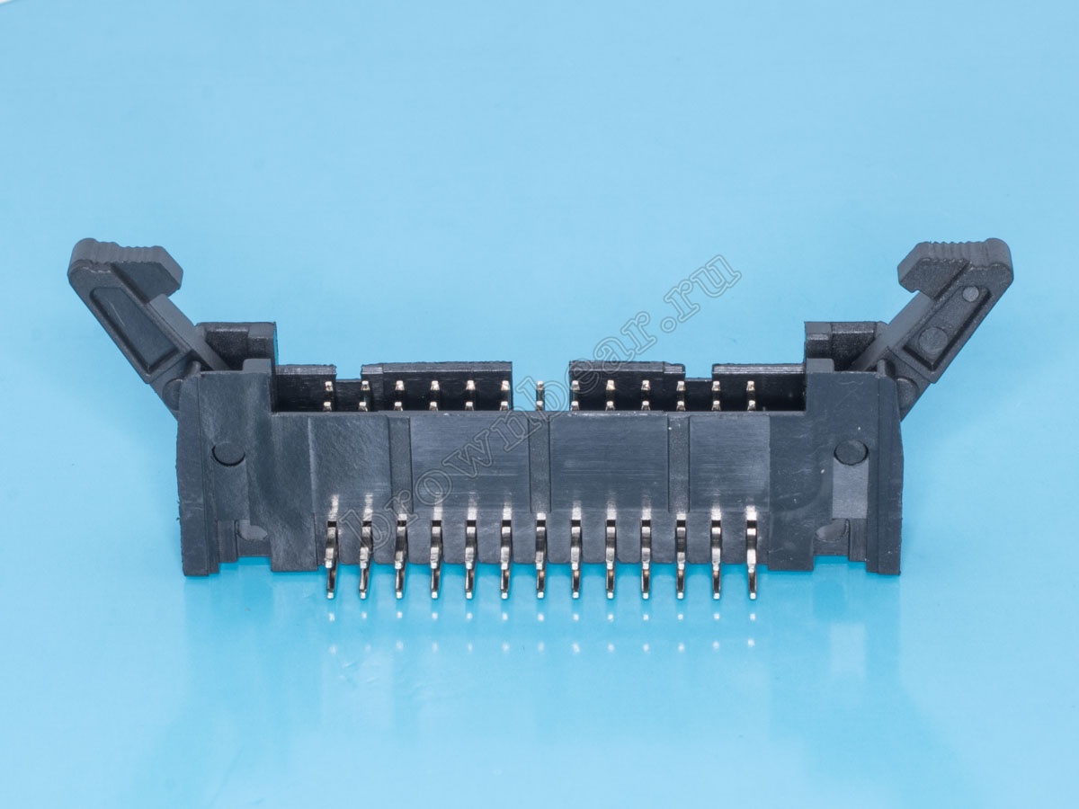 Ответная часть к разъёму IDC, штекер 26 контактов с шагом 2.54 мм, горизонтально устанавливается на плату, имеет боковые защёлки, позволяющие зафиксировать его с разъёмом IDC.