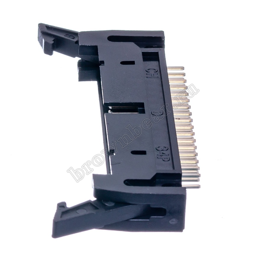 Ответная часть к разъёму IDC, штекер 34 контактов с шагом 2.54 мм, вертикально устанавливается на плату, имеет боковые защёлки, позволяющие зафиксировать его с разъёмом IDC.