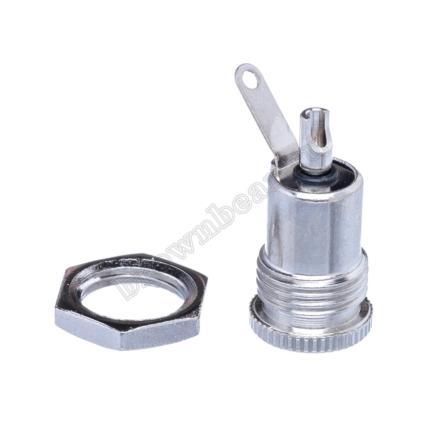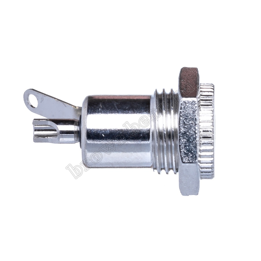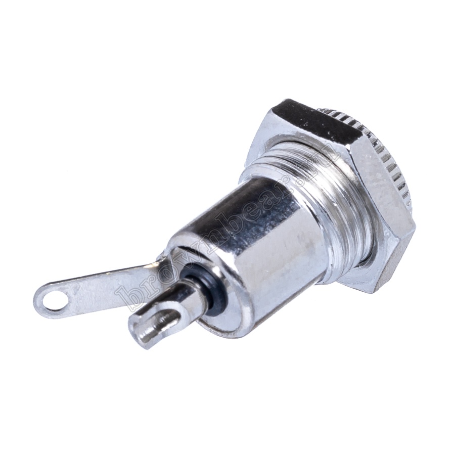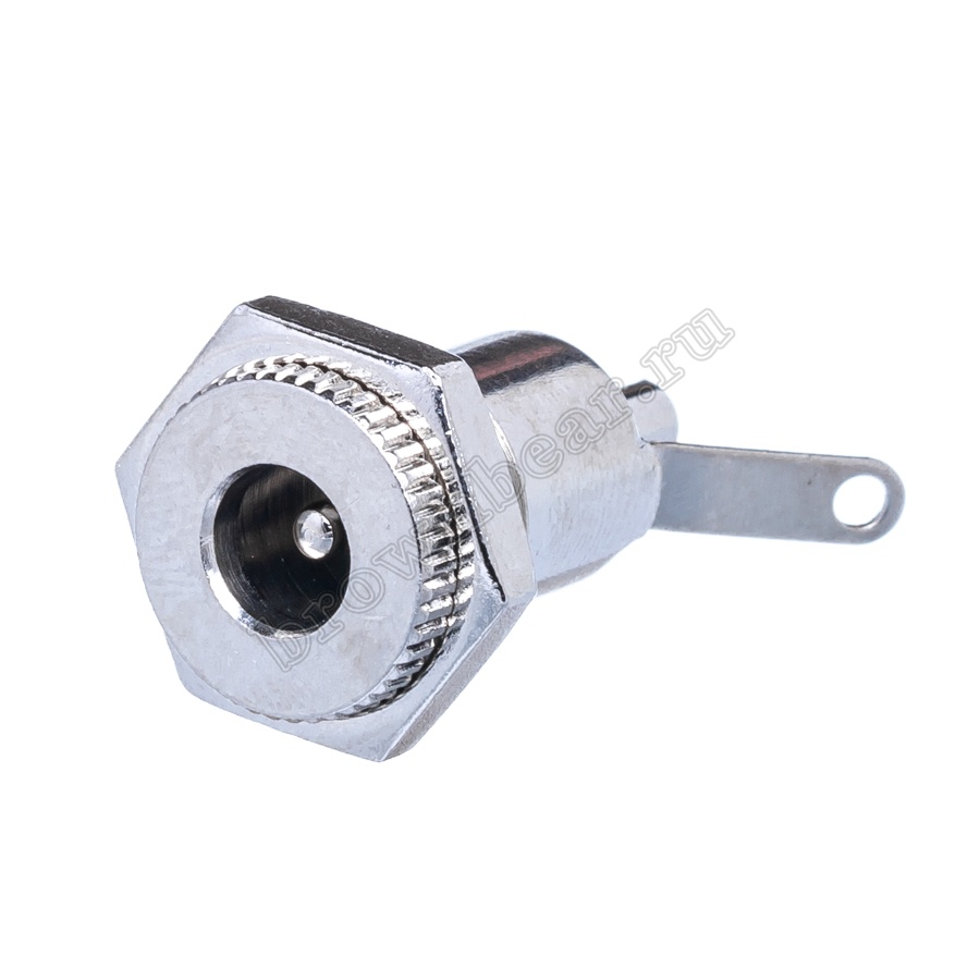 Гнездо питания DC 2.1 x 5.5 мм, на приборный блок в металлическом корпусе, крепление с помощью гайки.