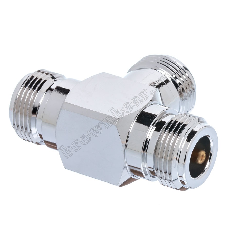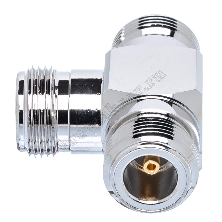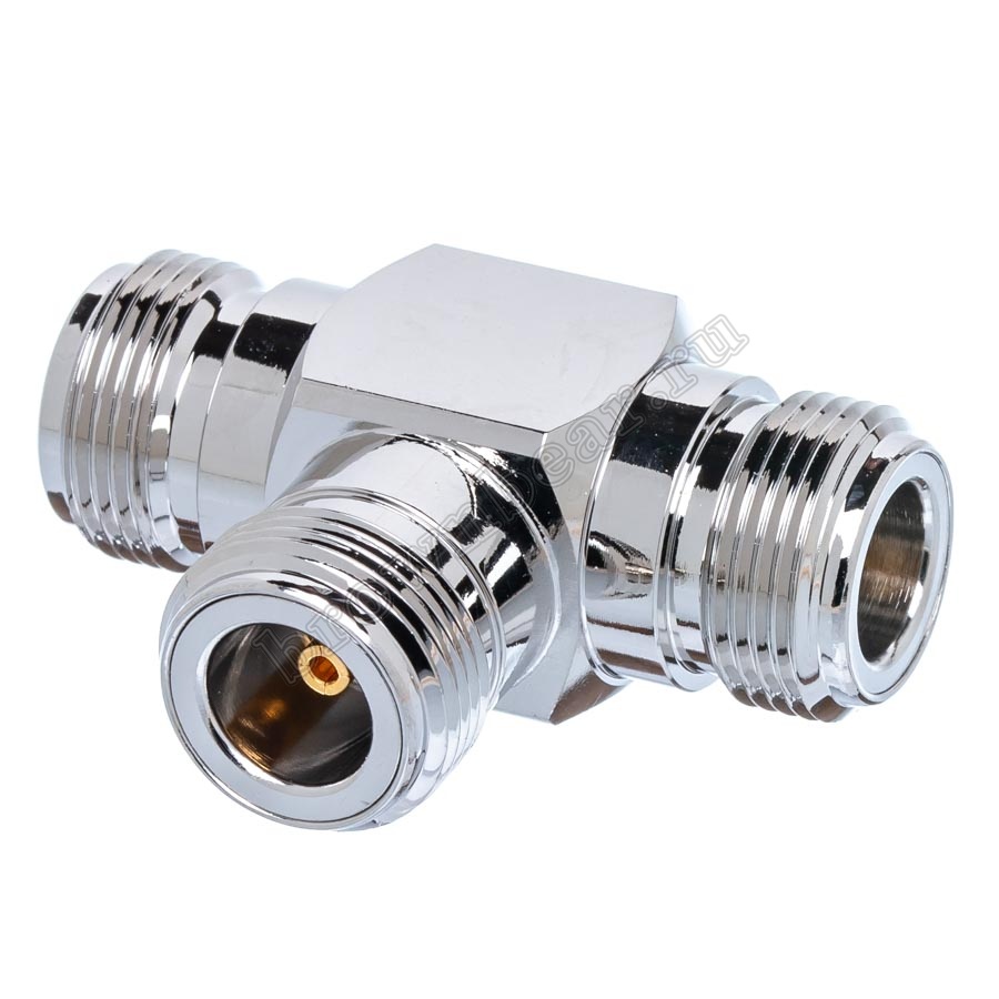 N тройник для соединения трёх коаксиальных кабелей с N-разъёмами в одной точке. Конструкция типа "female-female-female" (гнездо-гнездо-гнездо) обеспечивает удобное последовательное подключение оборудования или создание разветвления коаксиального кабеля.